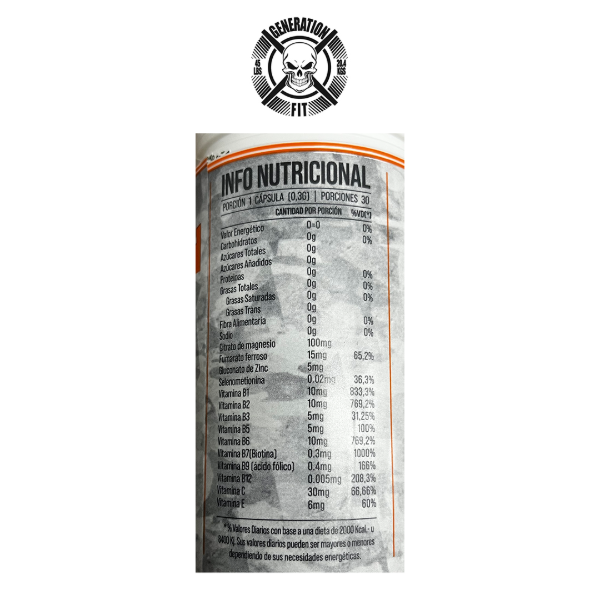 Citrato de magnesio: 100 mg Hierro ferroso: 15 mg Gluconato de zinc: 5 mg Selenometionina: 0.02 mg Vitaminas B, C, D y E en dosis equilibradas para un soporte integral.